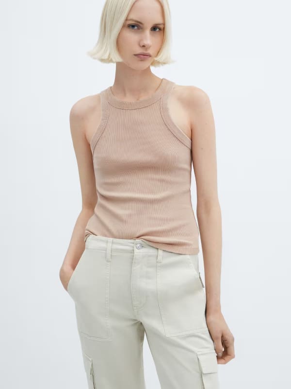 Thick knitted fabric. Short design. Straight design. Rounded neck. Sleeveless. Straps. Unclosed. Cable knit finish. Co-ord.